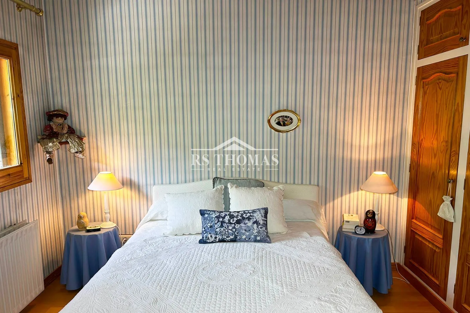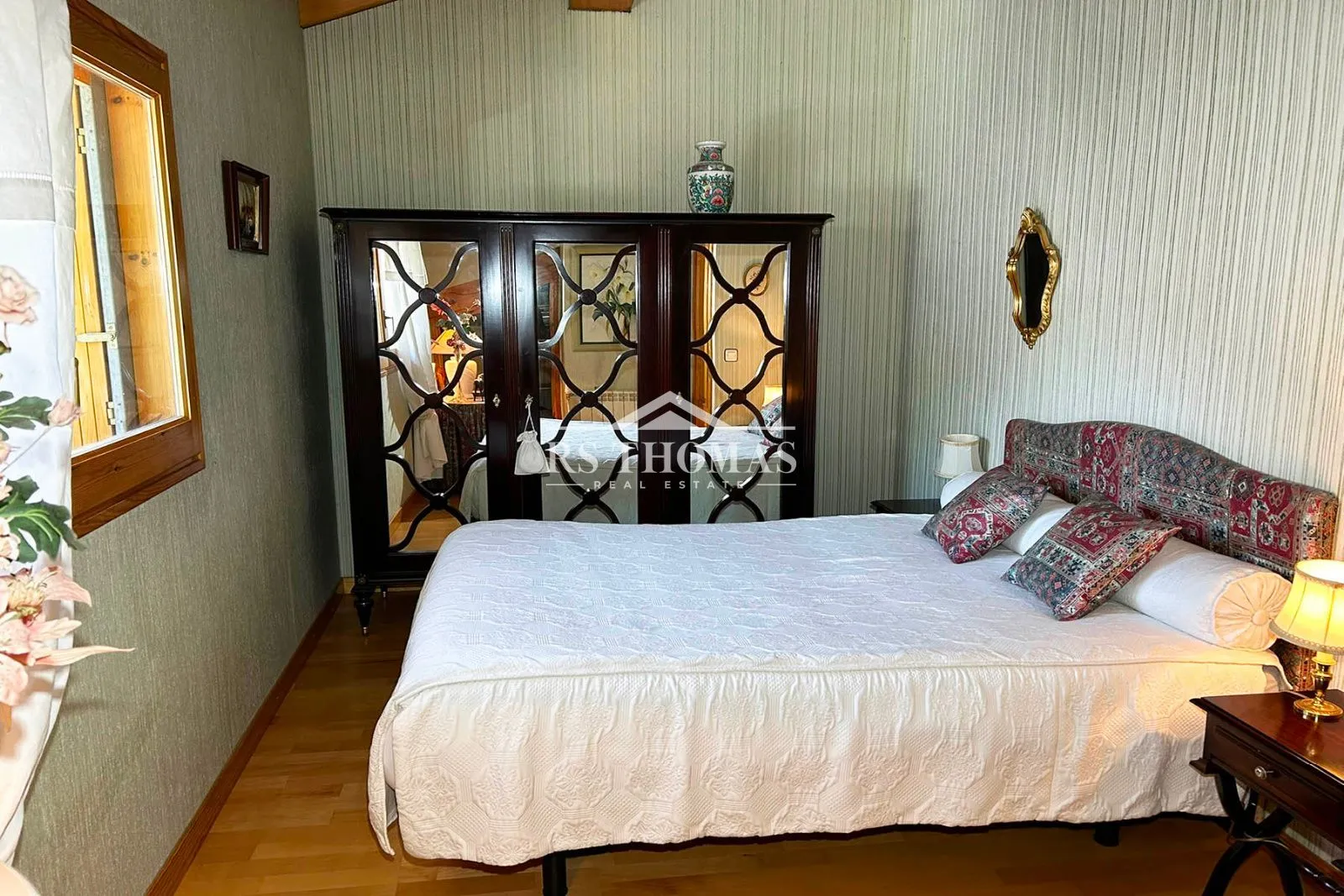 Planta Baixa: Dividida en dos nivells, en entrar a la casa trobem un rebedor acollidor que connecta amb el garatge per a dos cotxes, a més d’espai addicional per a un vehicle a l’exterior. Un lavabo de cortesia i un armari encastat complementen aquesta planta. Descendo, descobrim una cuina moderna tancada amb despensa, que s’obria cap a una destacada terrassa. El menjador-saló espaiós, amb una llar de foc tradicional de disseny encantador i grans finestrals de doble vidre amb persianes, ofereix vistes privilegiades i accés directe a la terrassa exterior, perfecta per relaxar-se i socialitzar.