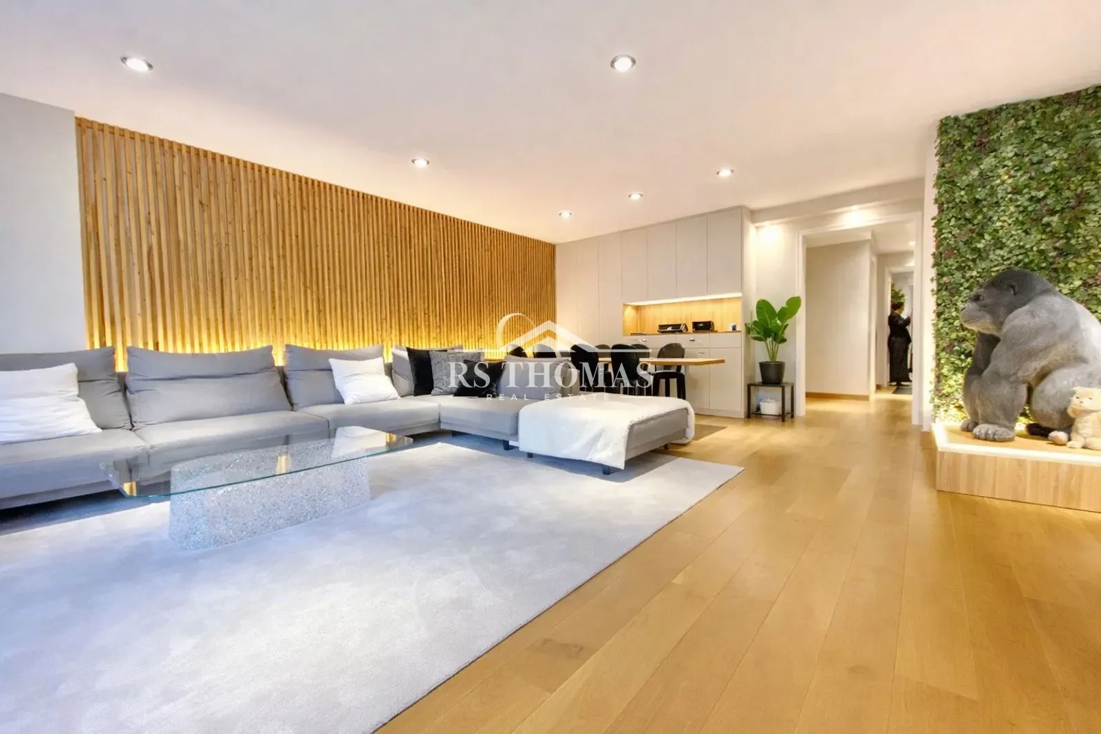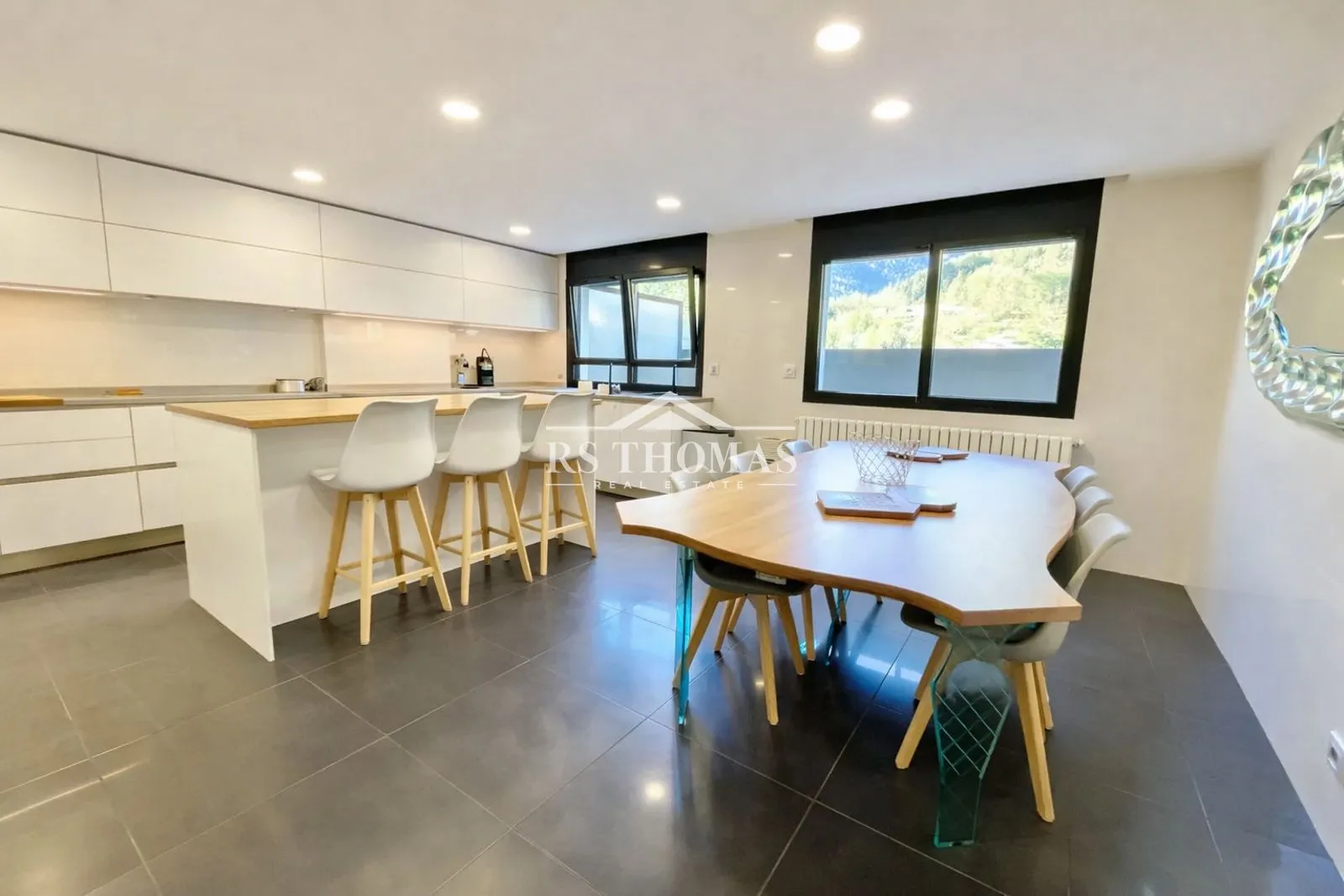 El espacioso salón-comedor de aproximadamente 50 m² ofrece una gran entrada de luz natural y agradables vistas despejadas. La cocina es independiente, muy amplia y totalmente equipada, ideal para el día a día y para disfrutar de momentos en familia.