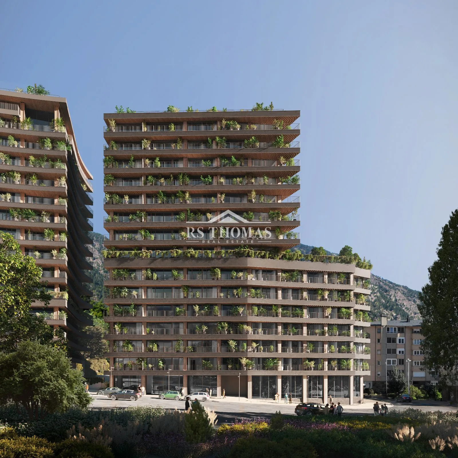Exclusiva vivienda de obra nueva situada en una moderna promoción residencial en el centro de Escaldes-Engordany, en una ubicación privilegiada próxima al Hospital Nostra Senyora de Meritxell y a pocos minutos del centro neurálgico de la parroquia.