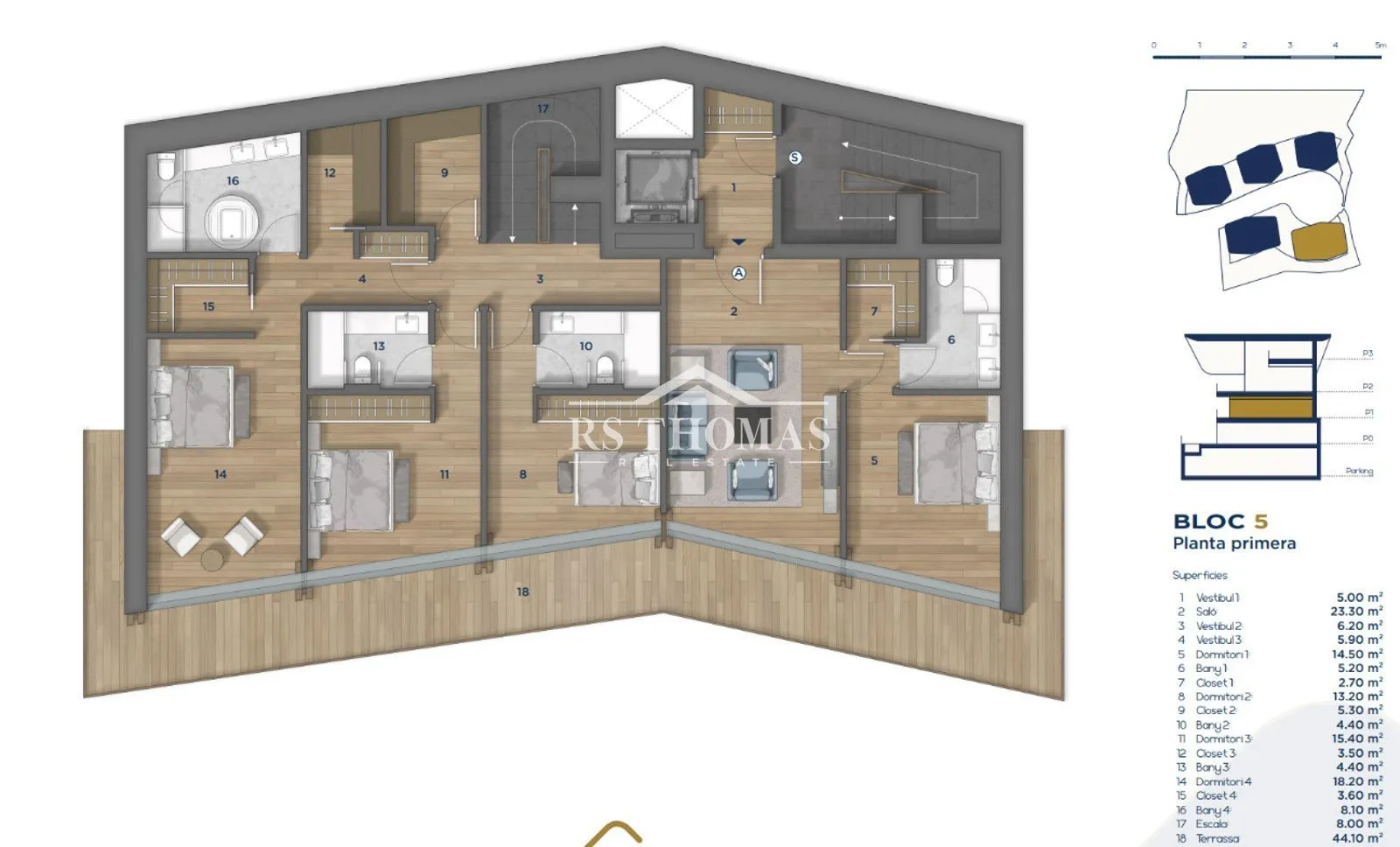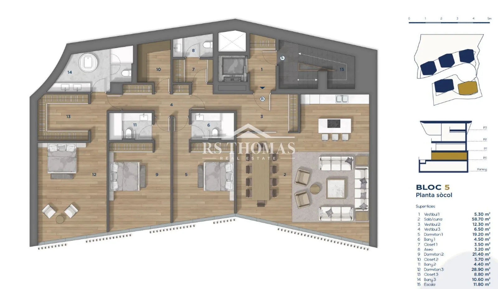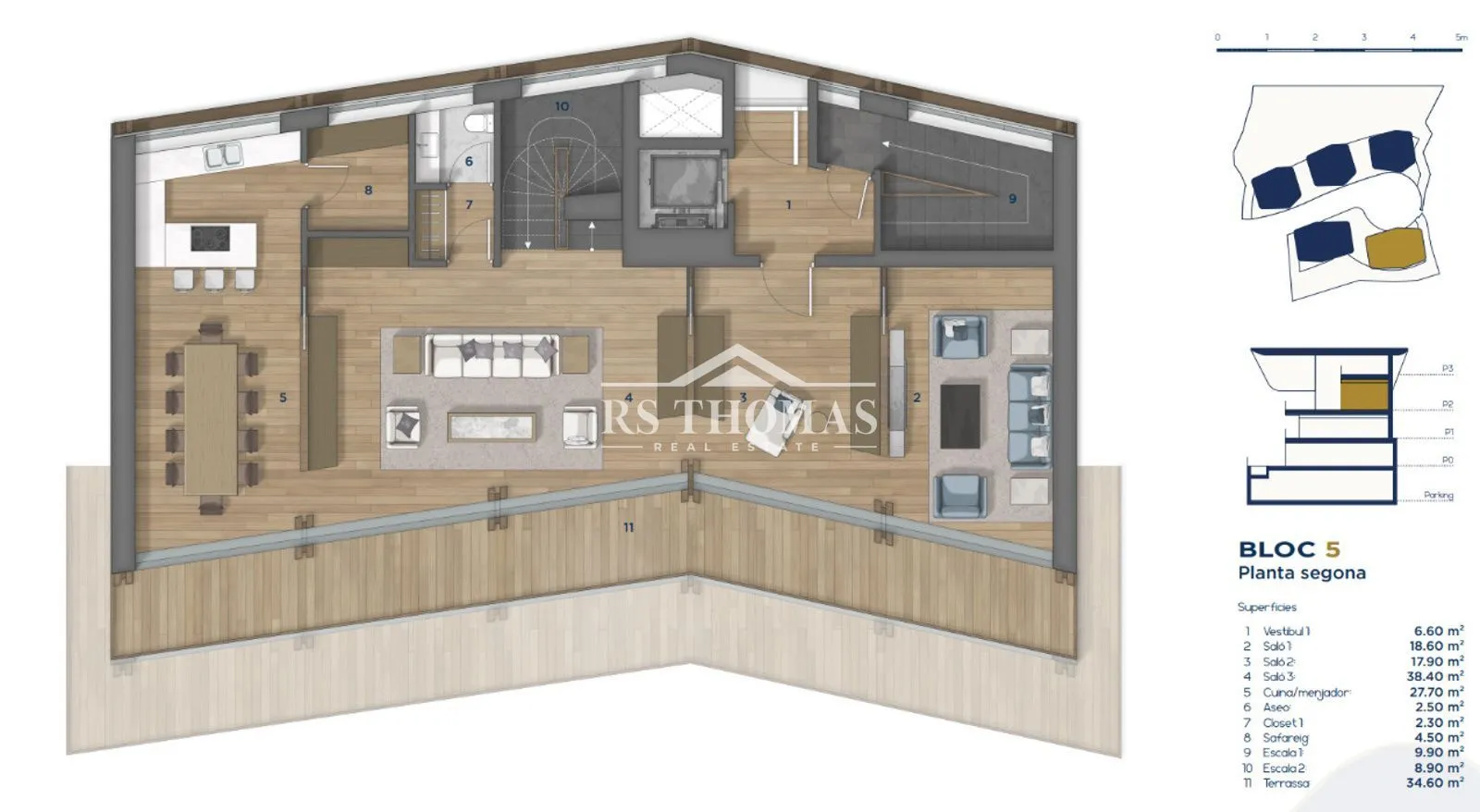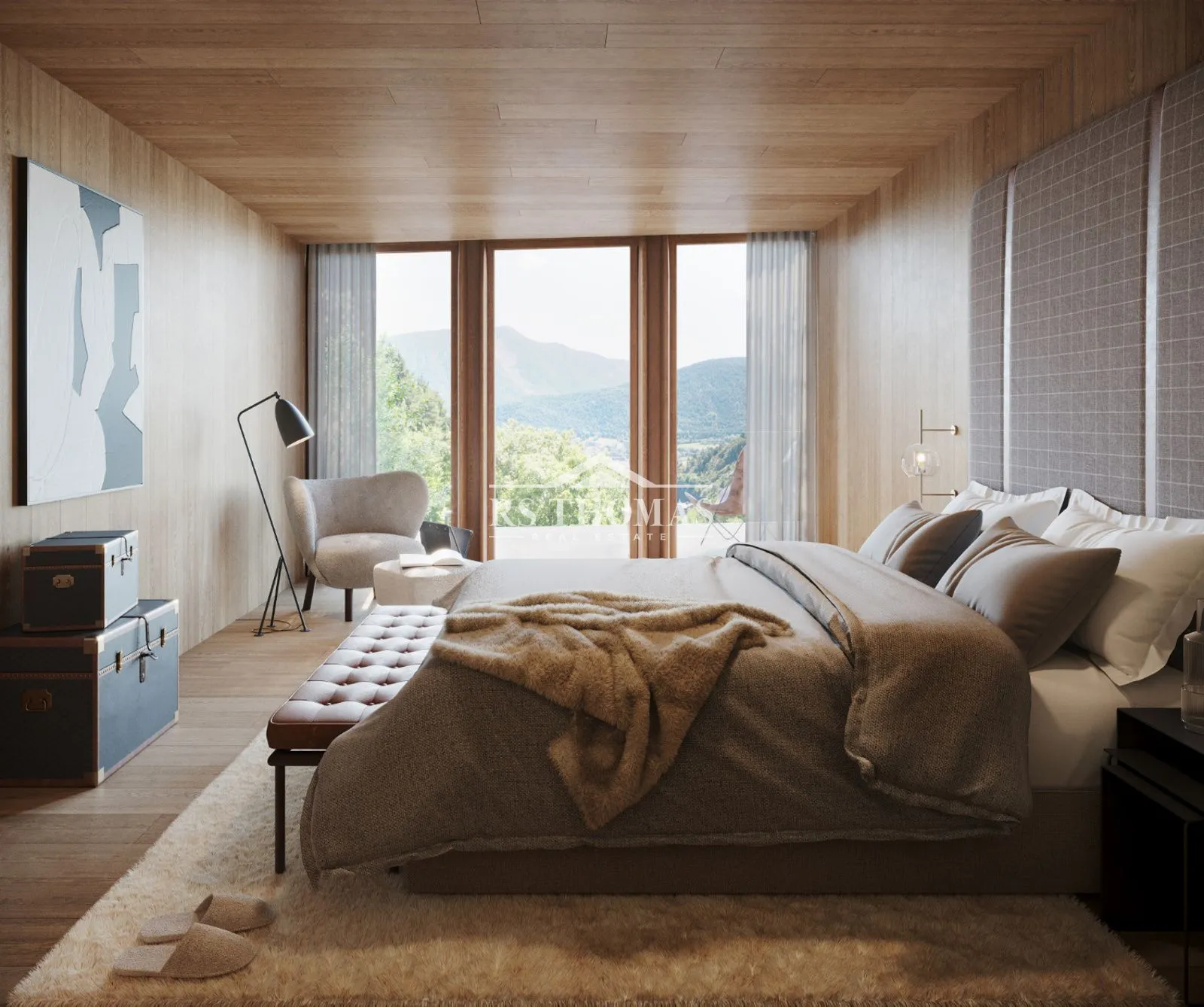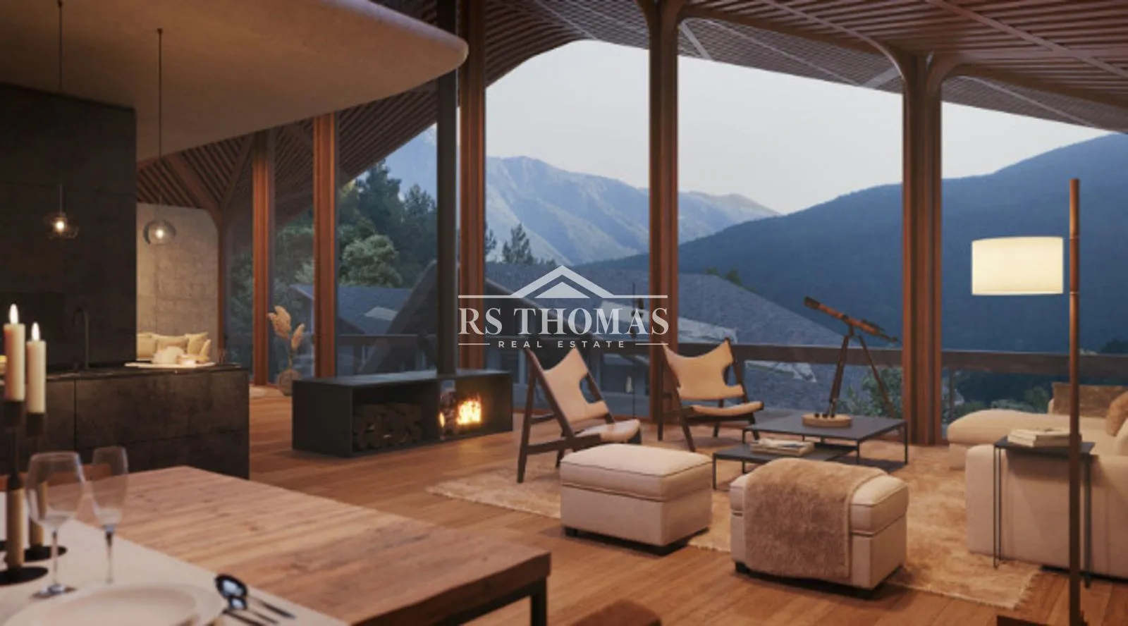Los acabados son elegantes y de alta gama, combinando elementos contemporáneos como grandes ventanales con materiales tradicionales como la piedra y la madera, logrando una perfecta integración con el entorno natural y respetando la arquitectura típica andorrana.
