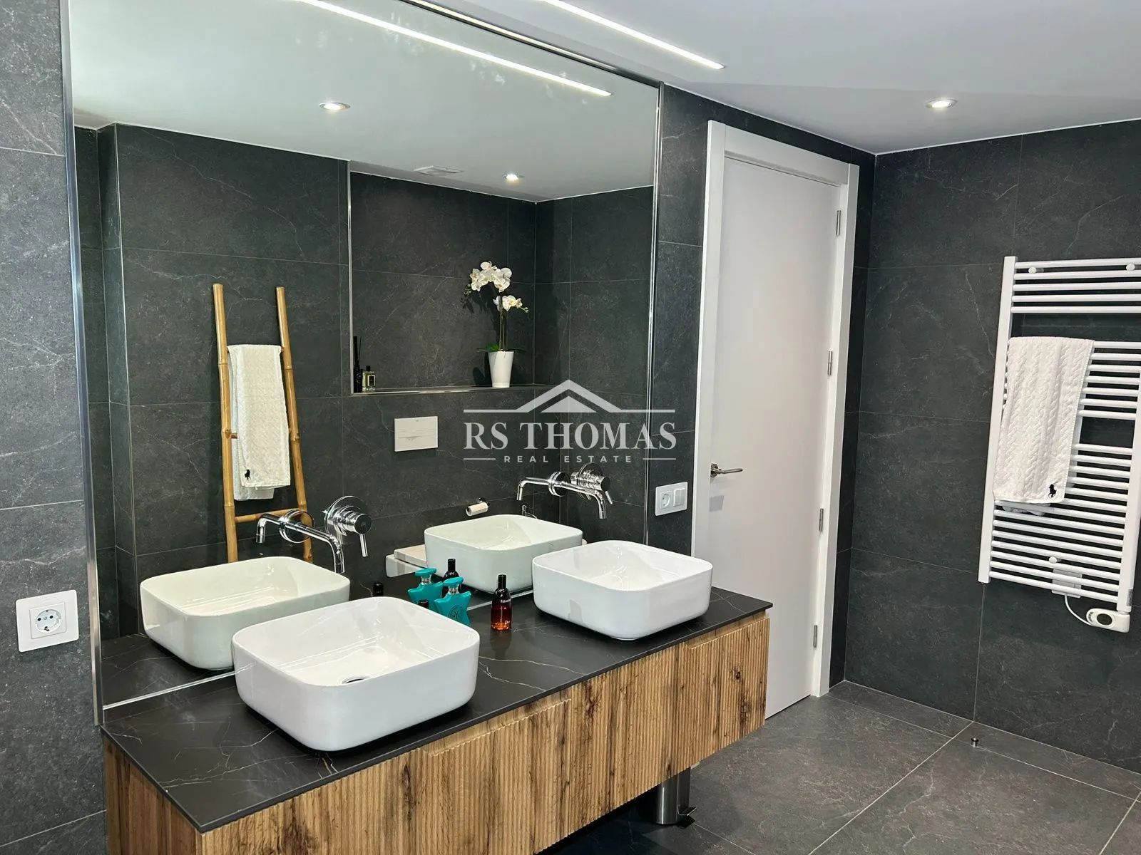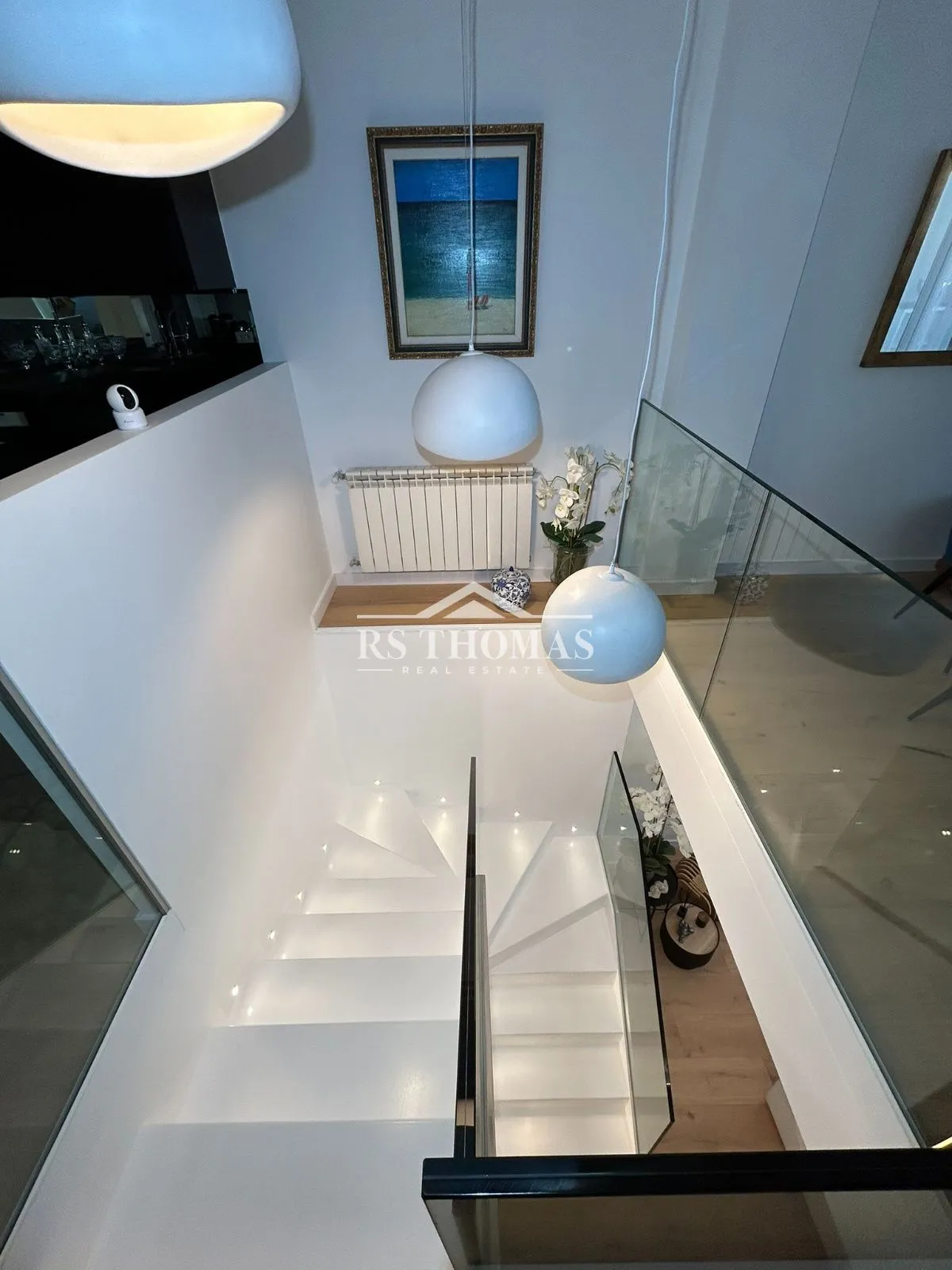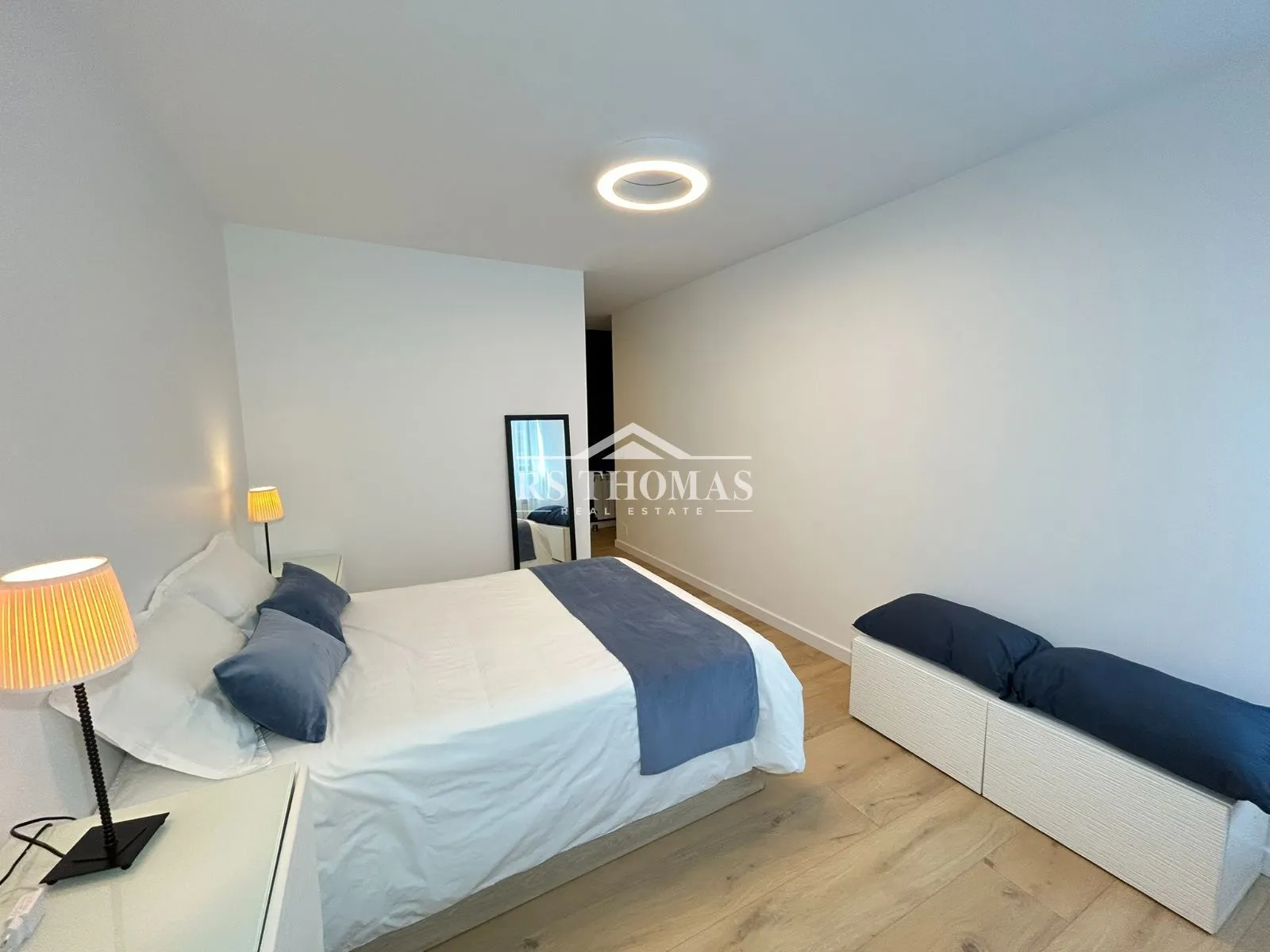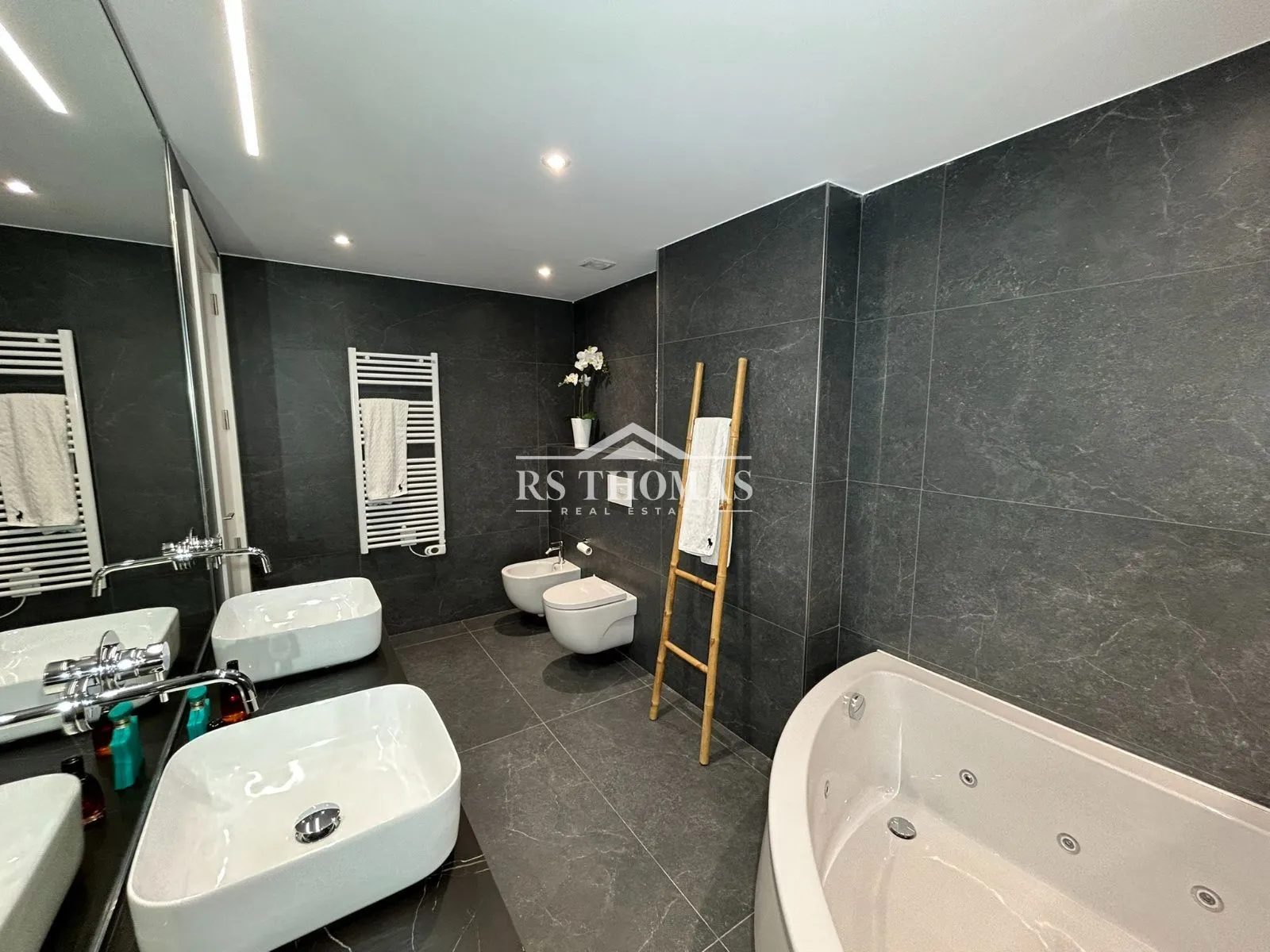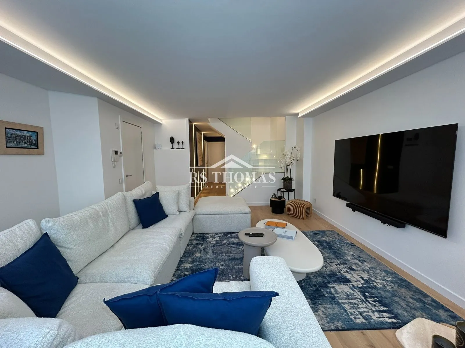 Se distribuye en dos plantas perfectamente diferenciadas. En la planta baja encontramos un elegante recibidor con aseo de cortesía que da paso a un amplio y acogedor salón, con iluminación LED indirecta que aporta calidez al espacio. En esta planta también se dispone un dormitorio doble en suite, una zona diáfana con baño completo y jacuzzi —ideal como gimnasio, despacho o dormitorio principal—, una práctica zona de lavandería y espacio de almacenamiento adicional.