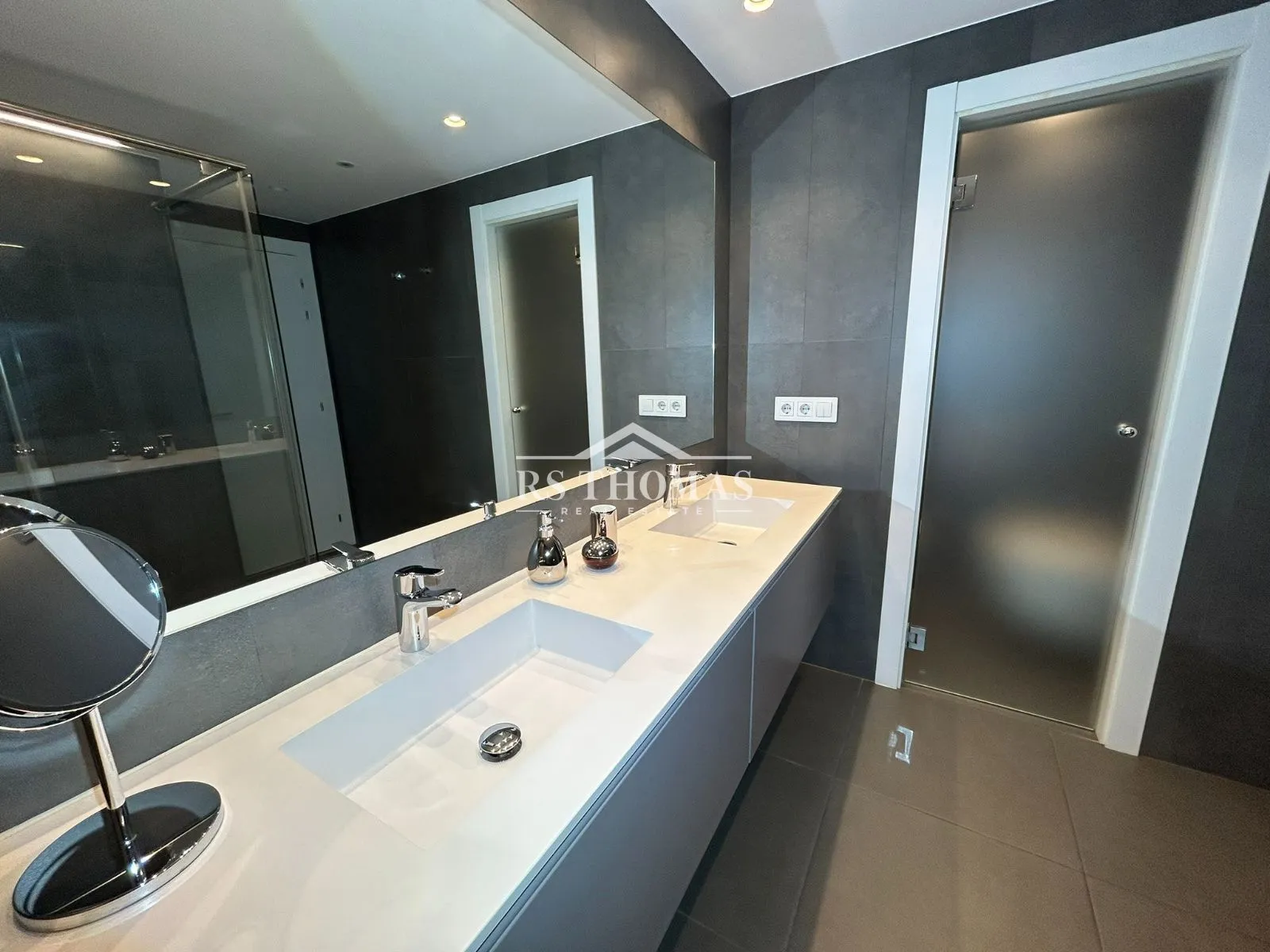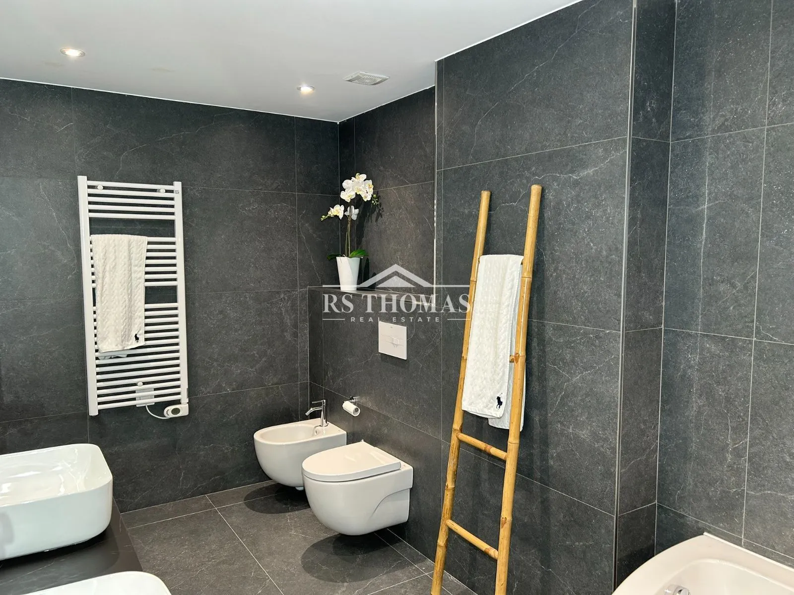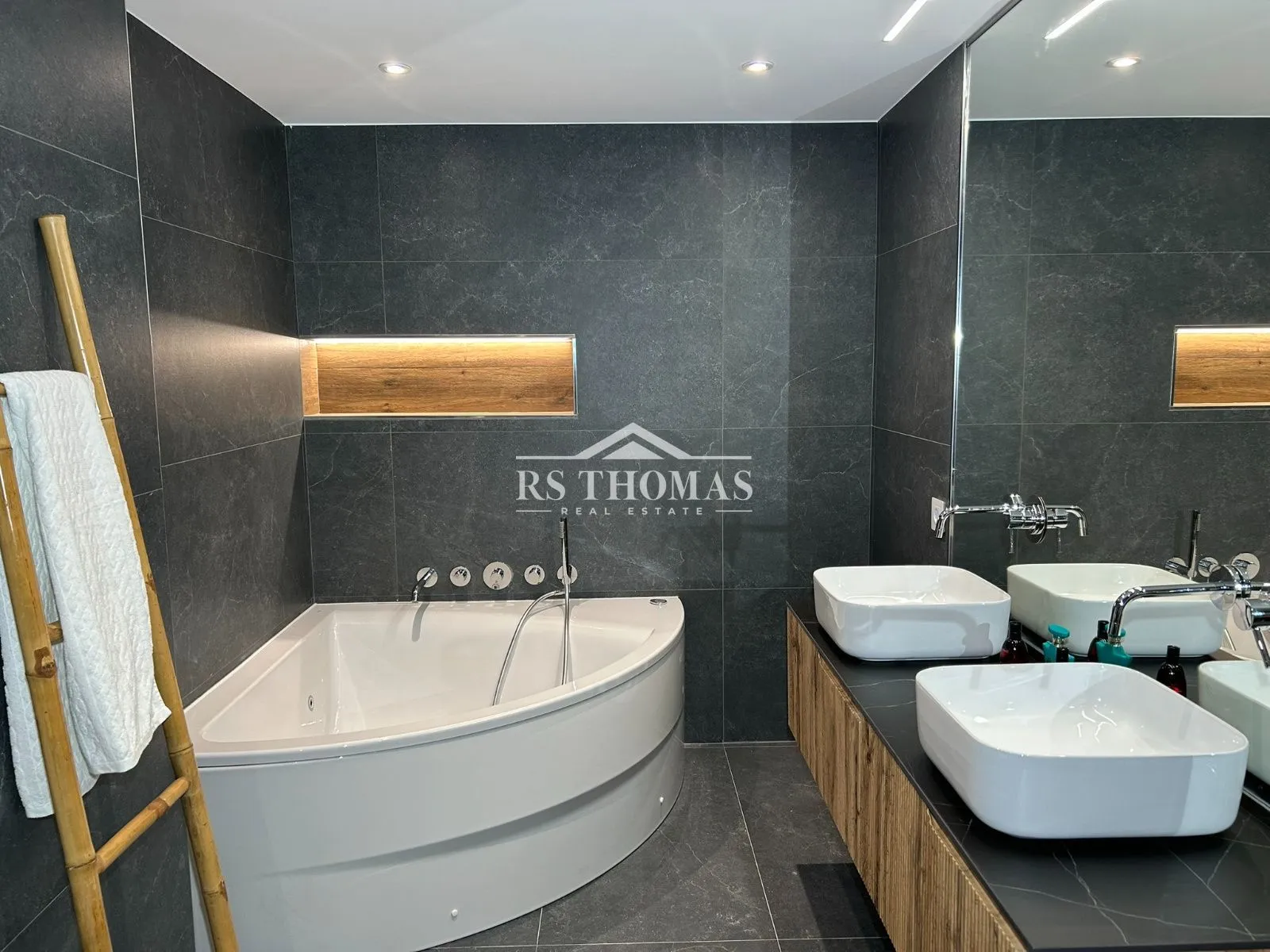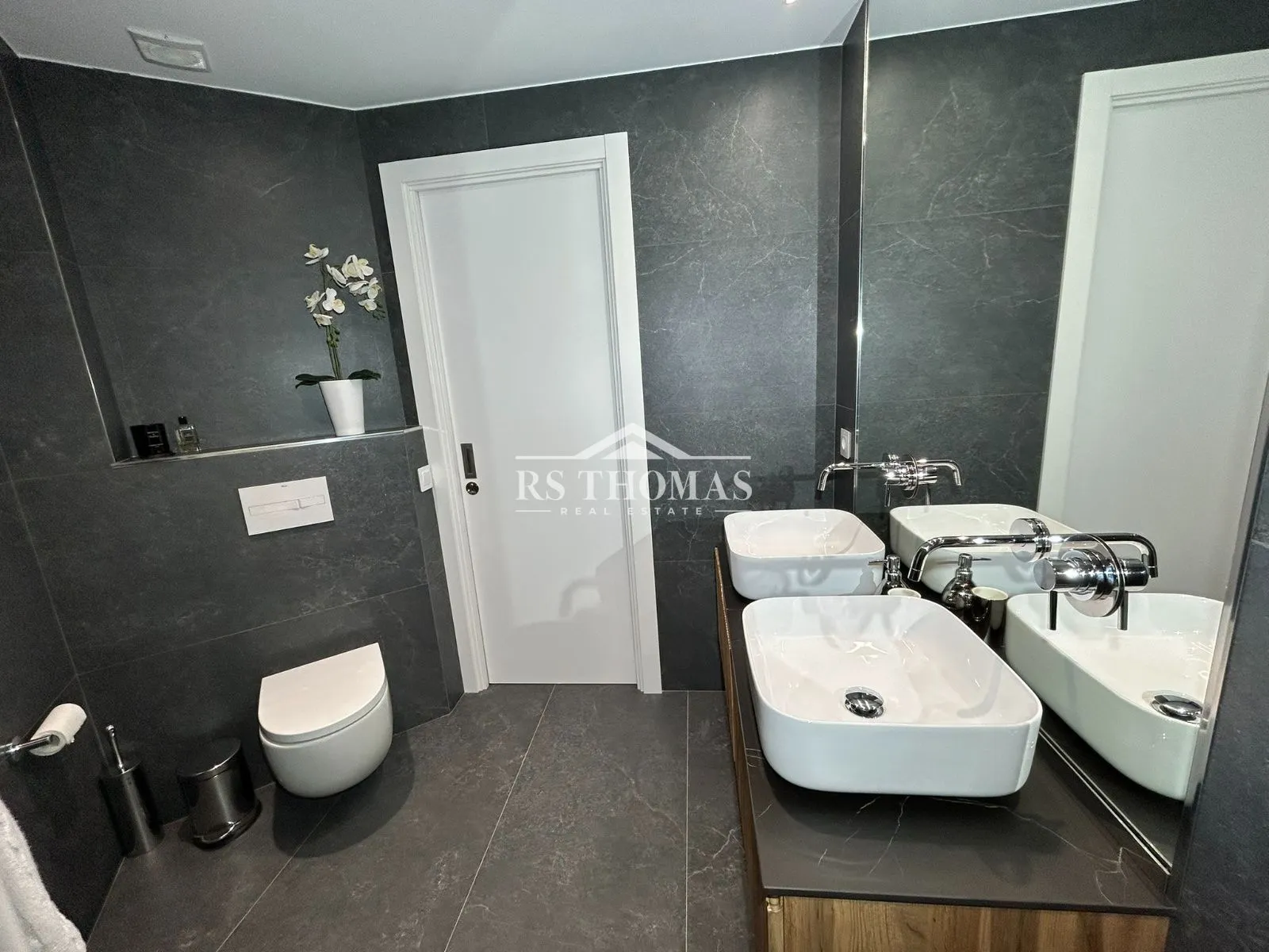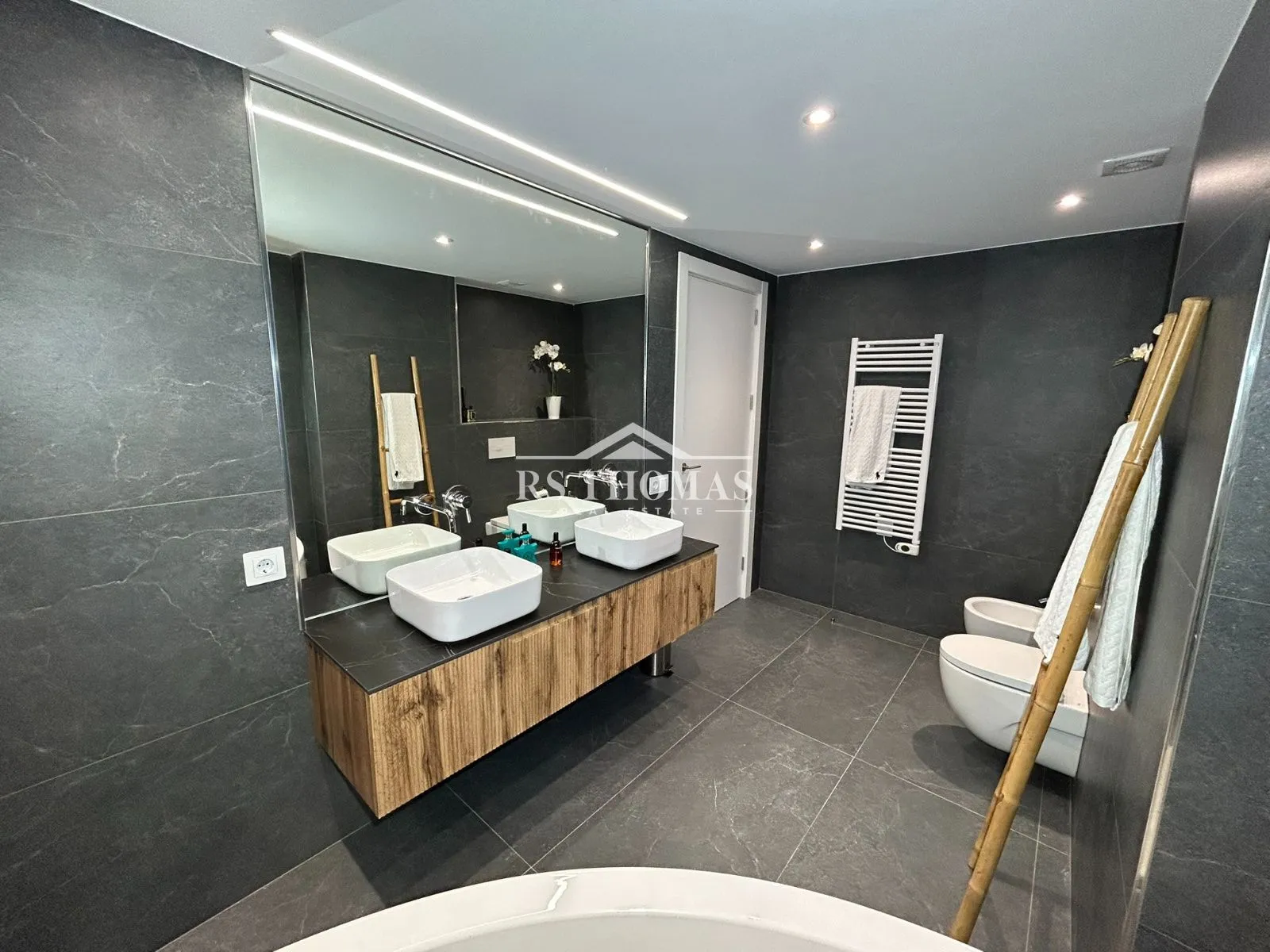 Se distribuye en dos plantas perfectamente diferenciadas. En la planta baja encontramos un elegante recibidor con aseo de cortesía que da paso a un amplio y acogedor salón, con iluminación LED indirecta que aporta calidez al espacio. En esta planta también se dispone un dormitorio doble en suite, una zona diáfana con baño completo y jacuzzi —ideal como gimnasio, despacho o dormitorio principal—, una práctica zona de lavandería y espacio de almacenamiento adicional.