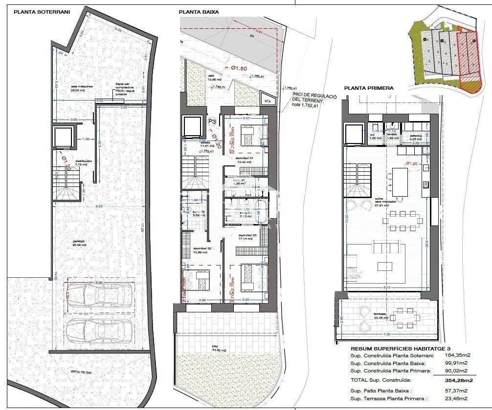 En la planta subterránea de la propiedad encontramos un garaje de 95m² con capacidad para 5 vehículos y la sala técnica de la propiedad. Conectamos esta planta con la principal mediante unas escaleras y un ascensor. En la planta principal encontramos la zona de noche formada por tres dormitorios en suite con vestidor y baño completo, todas las suites tienen ducha y una de ellas también tiene bañera. Todas las estancias son exteriores y luminosas. En esa planta destacamos el maravilloso jardín de 57 m² que rodea la casa y nos ofrece una sensación de amplitud.