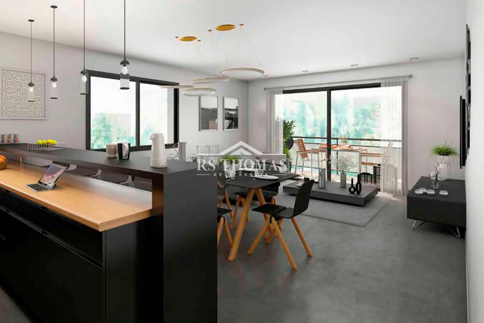 En la zona de día encontramos un amplio y luminoso salón comedor con vistas exteriores y salida a una terraza cubierta de 11,70 m². Junto a esta estancia, encontramos una cocina abierta totalmente equipada con electrodomésticos de alta calidad, como la campana extractora, la placa de inducción y el horno eléctrico de la casa Bosch, el fregadero de acero inoxidable de la marca Roca y las griferías Grohe. Esta zona se complementa con un baño independiente completo y una sala destinada a la lavandería.