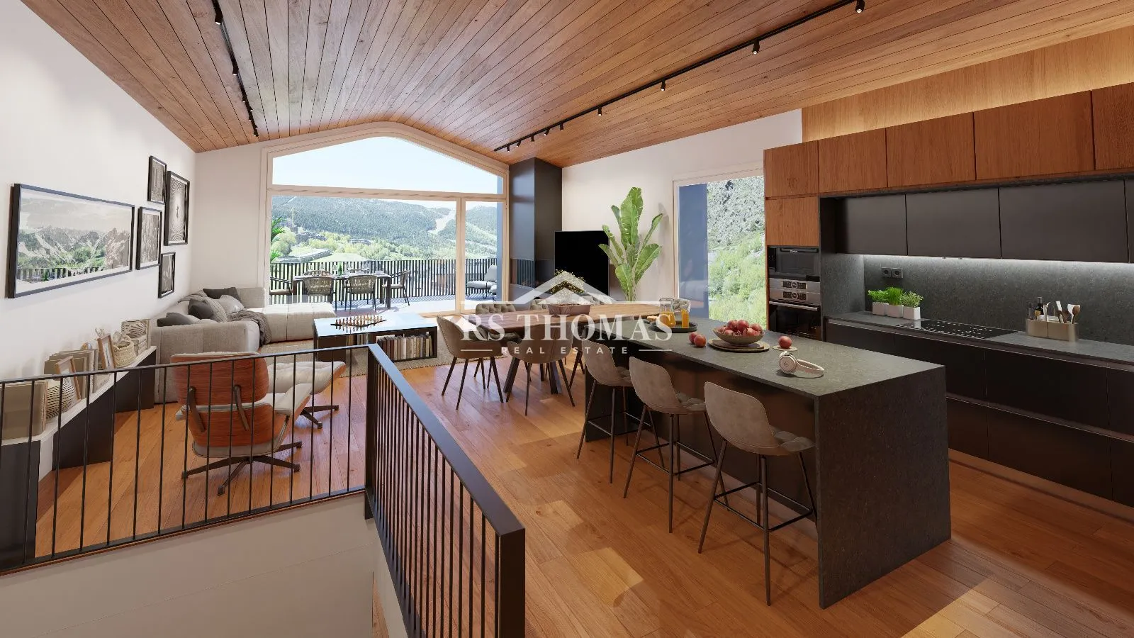 La planta superior de la propiedad está destinada a la zona de día donde tenemos una amplia cocina totalmente equipada con electrodomésticos de alta gama integrada al salón-comedor con una fantástica chimenea. Desde el comedor tenemos acceso a una bonita terraza que nos ofrecerá unas increíbles vistas a las pistas de esquí y a las montañas. Esta zona se complementa con un aseo de cortesía y un espacio para la lavandería.