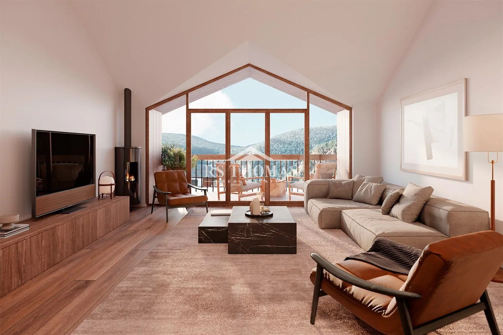 En la zona de día encontramos un amplio y luminoso salón-comedor con chimenea y salida directa a una terraza de 8.5m². Junto al comedor disponemos de una cocina abierta totalmente equipada. Esta estancia se complementa con una sala independiente destinada para la lavandería.