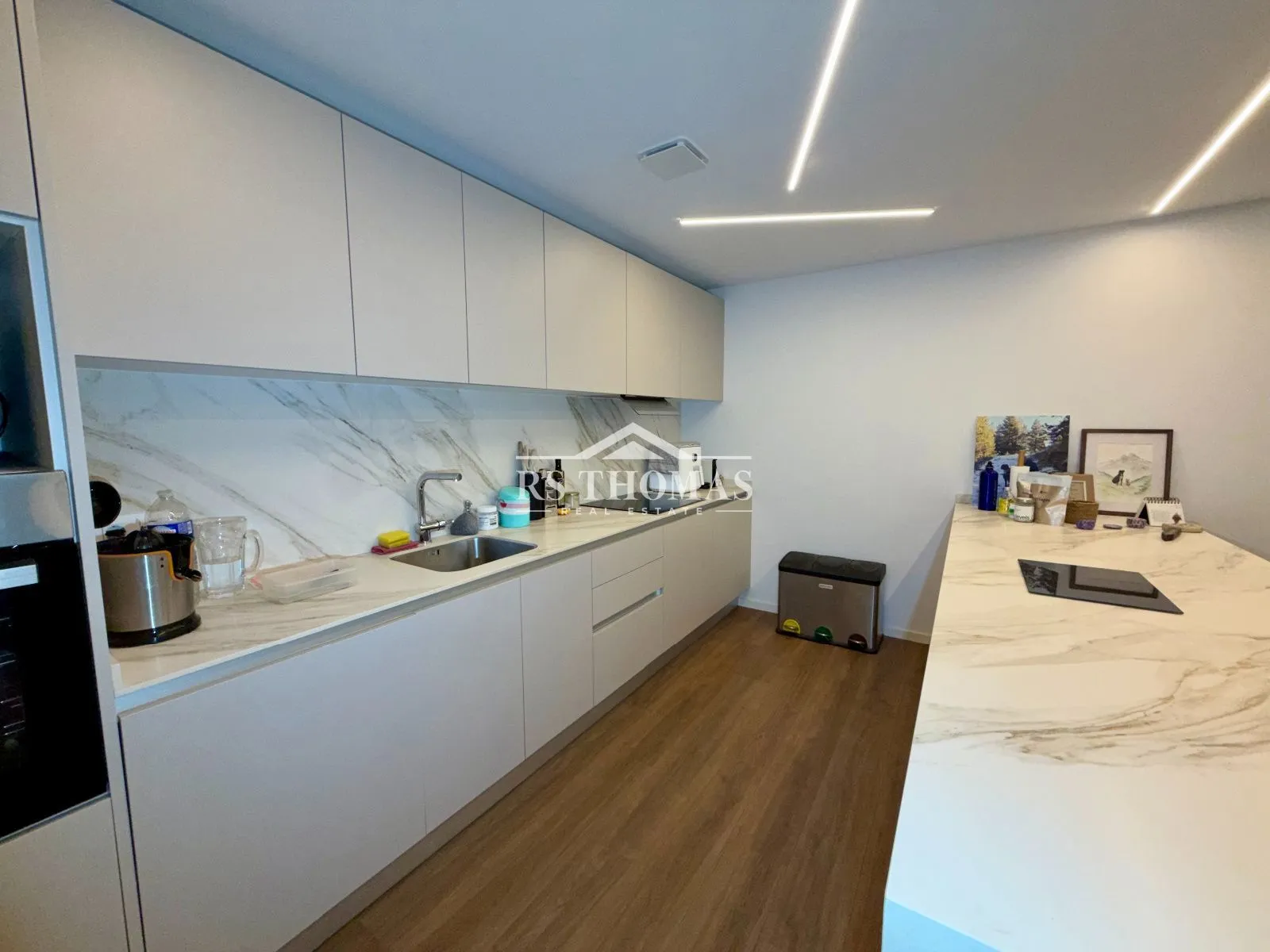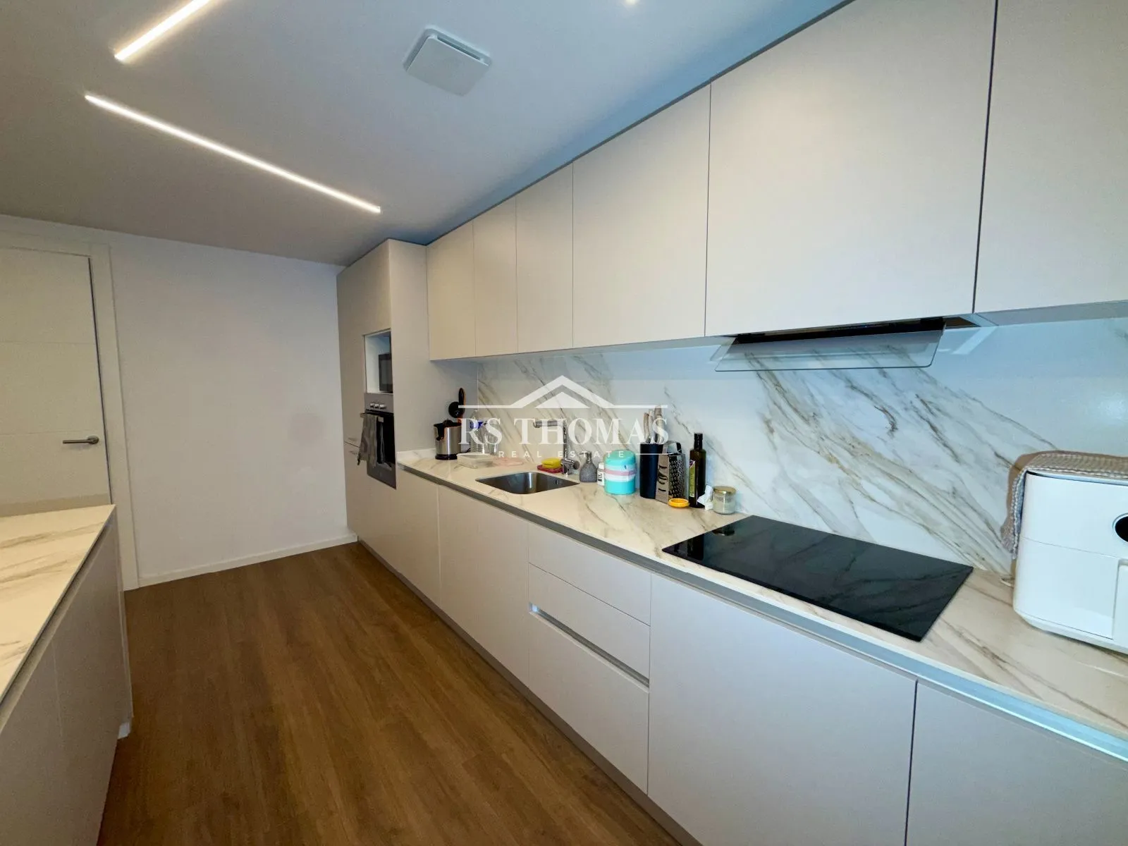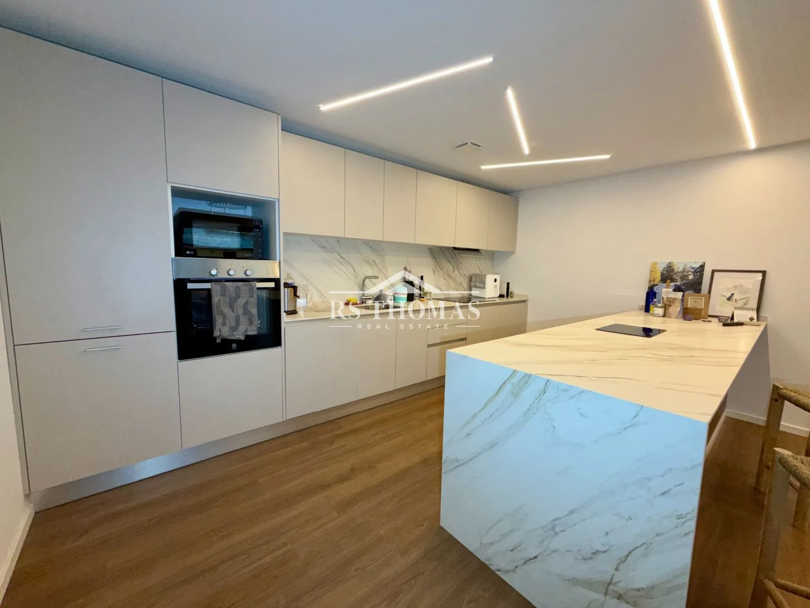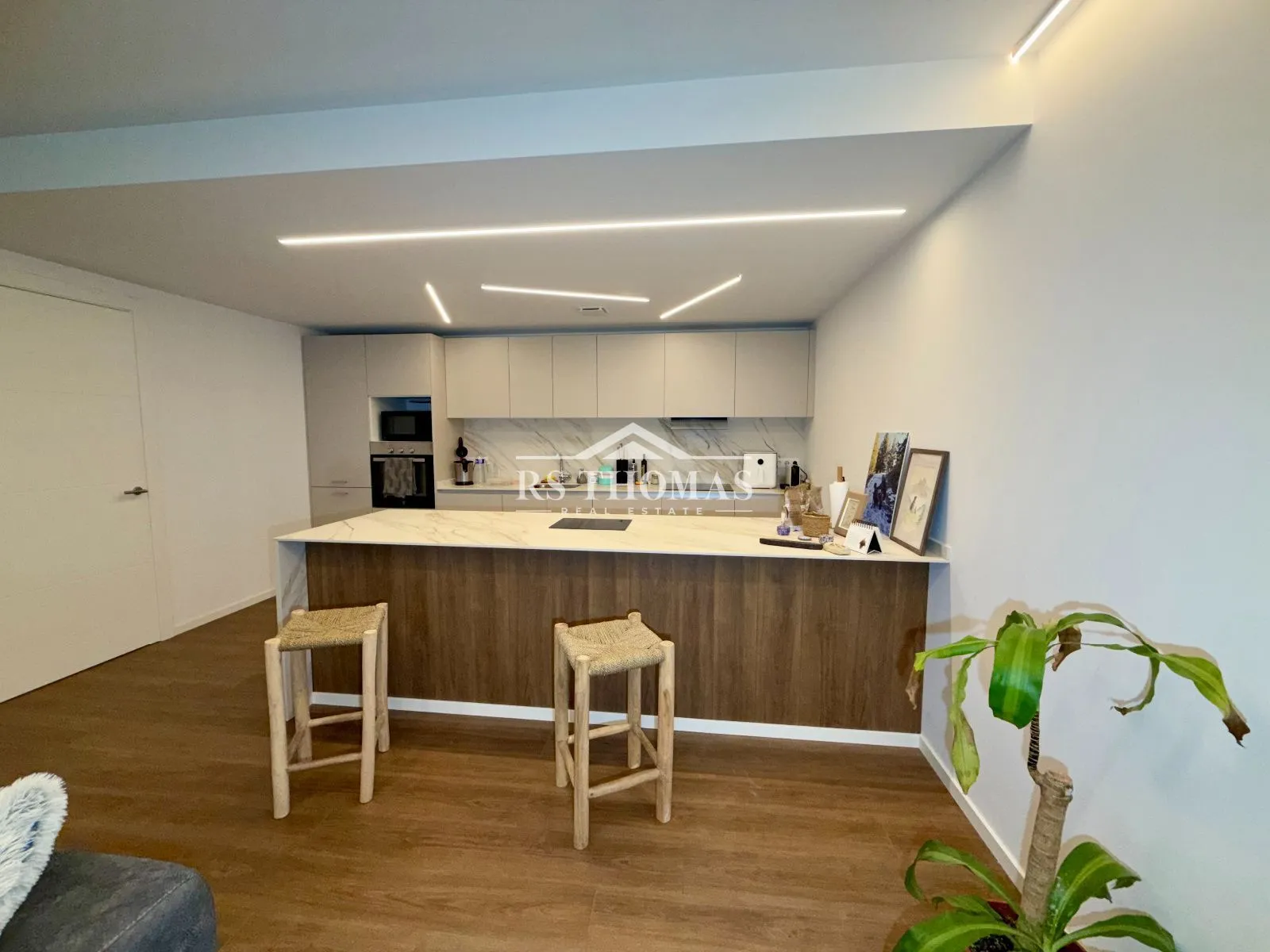 Le logement dispose d’un hall d’entrée avec placards intégrés, offrant un espace de rangement pratique dès l’arrivée. La pièce de vie comprend un spacieux salon-salle à manger avec cheminée électrique et accès direct au balcon, créant un espace chaleureux et lumineux. La cuisine est ouverte et équipée d’un îlot central pratique, avec un espace buanderie indépendant.