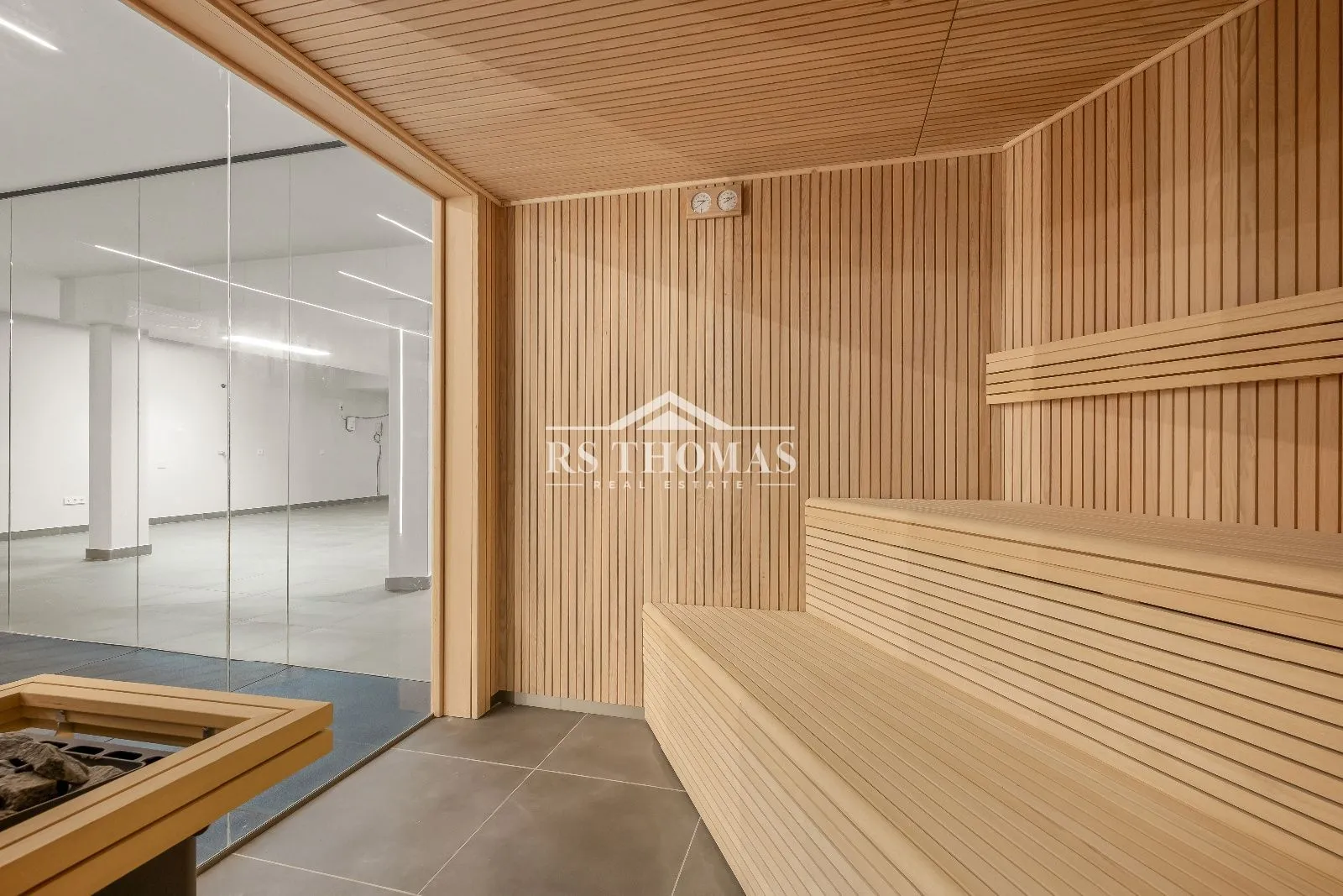 El sótano dispone de un amplio garaje para 4-5 coches, vestíbulo y zona de recibidor, además de incluir una sauna, gimnasio y aseo, ideal para mantenerte en forma y relajarte en tu hogar.