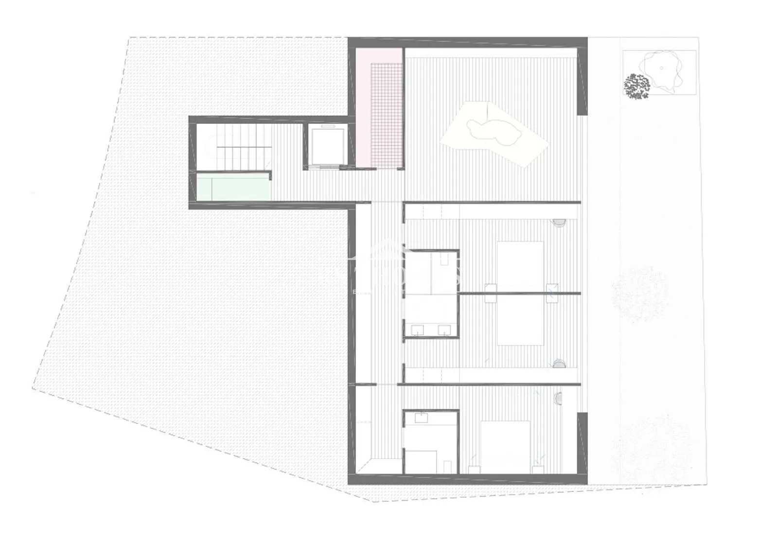 La planta segona, de 180 m², està distribuïda amb una sala d’estar de 39 m² amb previsió per incorporar una cuina, un safareig, una sala tècnica i tres habitacions: dues dobles de 19 m² i una suite de 28 m². Aquesta planta compta també amb un lavabo de 6,5 m² i un distribuïdor ampli.