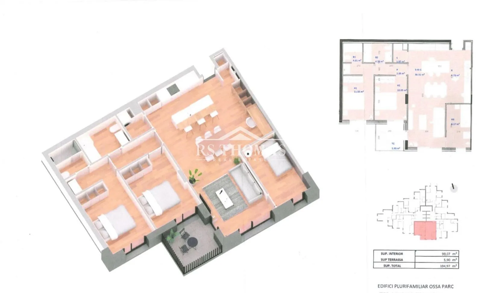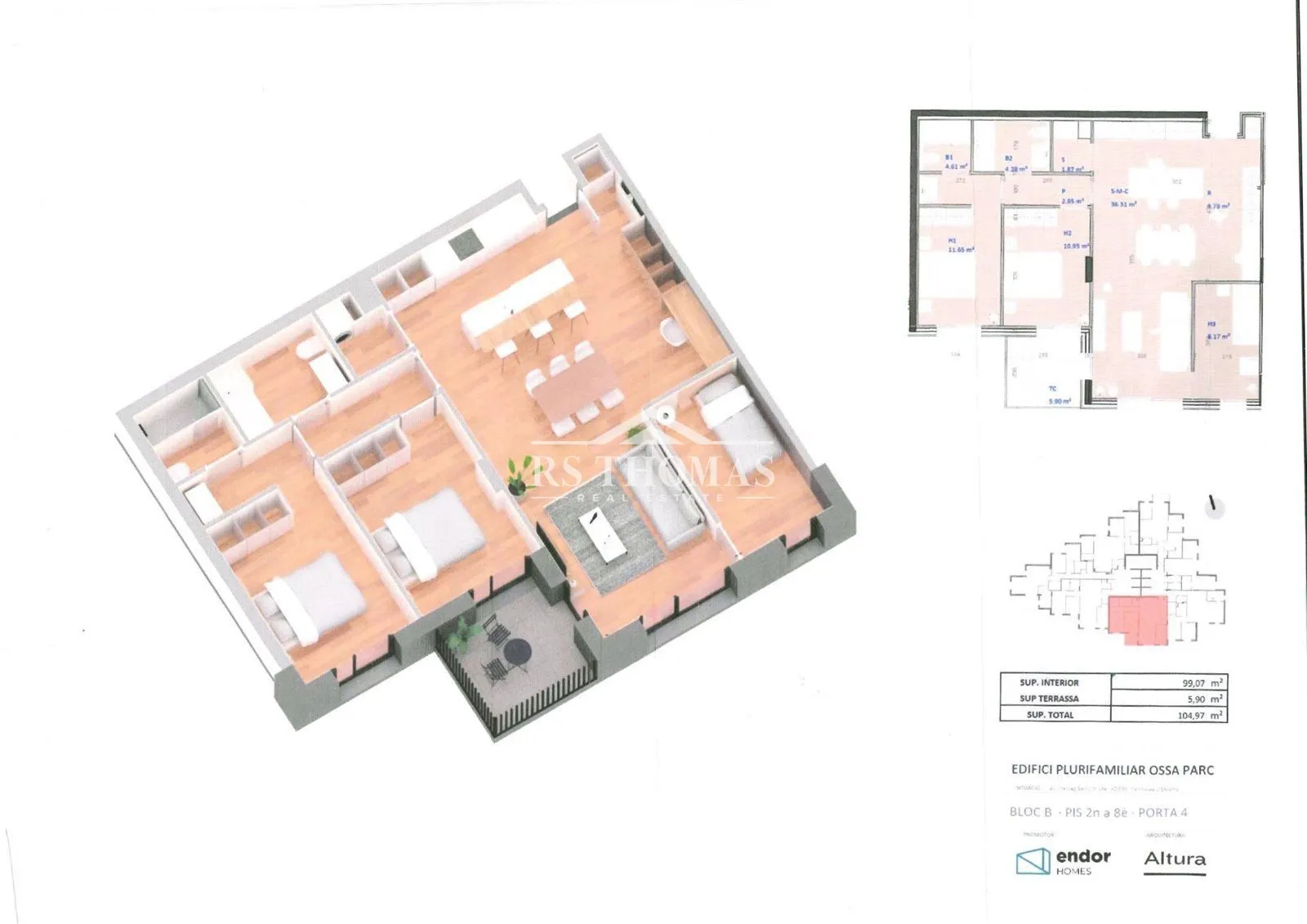 Descubre este magnífico piso de obra nueva de 100 m² situado en el exclusivo Ossa Parc, Encamp. Al entrar al luminoso salón comedor, te cautivará la moderna cocina abierta y el acceso directo a una encantadora terraza de 6 m², ideal para disfrutar de momentos al aire libre...La zona de descanso está diseñada para ofrecer el máximo confort con dos dormitorios dobles, incluyendo una suite principal con baño completo y vestidor. El tercer dormitorio es individual, perfecto para un despacho o habitación de huéspedes. Todos los dormitorios son exteriores y cuentan con armarios empotrados, asegurando abundante luz natural y almacenamiento eficiente.