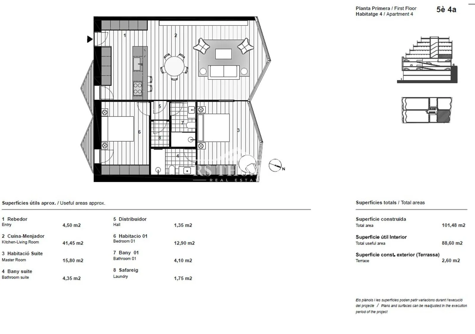 Este moderno apartamento cuenta con dos espaciosos dormitorios y dos baños completos, ideales para familias o inversores que buscan confort y funcionalidad. La propiedad incluye una terraza de 2,60 m², perfecta para momentos de ocio y relax al aire libre.