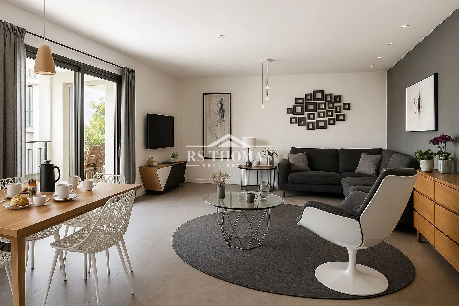 En la zona de día encontramos un amplio y luminoso salón comedor con vistas exteriores y salida a una terraza cubierta de 11,70 m². Junto a esta estancia, encontramos una cocina abierta totalmente equipada con electrodomésticos de alta calidad, como la campana extractora, la placa de inducción y el horno eléctrico de la casa Bosch, el fregadero de acero inoxidable de la marca Roca y las griferías Grohe. Esta zona se complementa con un baño independiente completo y una sala destinada a la lavandería.