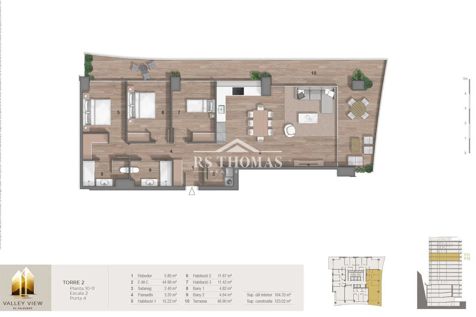 Exclusivo piso de obra nueva para comprar en Escaldes-Engordany, ubicado en un emplazamiento inigualable frente al Hospital Nuestra Senyora de Meritxell a pocos minutos a pie del centro neurálgico de la parroquia...Esta propiedad dispone de una superficie construida de 123.02 m² y una terraza de 46.90 m² con acceso directo desde el comedor y cualquiera de las estancias de noche. ..La propiedad se distribuye de la siguiente manera:.En la zona de día encontramos un amplio recibidor que nos conecta con un espectacular salón-comedor con acceso directo a la terraza y una cocina abierta integrada con electrodomésticos de alta gama. En esta zona encontramos una sala para la lavandería. ..La zona de noche está compuesta por tres dormitorios dobles, de los cuales uno de ellos en suite con vestidor y un baño completo con ducha. Todos los dormitorios tienen armarios empotrados y son exteriores. Esta zona se complementa con otro baño completo con ducha...Esta magnífica propiedad está pensada hasta el más mínimo detalle, con acabados de alta calidad como el suelo radiante en cada una de las estancias, sistema de domótica en toda la propiedad, electrodomésticos de la marca Siemens o similar, entre otros...Destacamos de esta promoción las maravillosas zonas comunes para los propietarios, piscina cubierta climatizada con zona de relax y vistas a la zona ajardinada exterior, un gimnasio totalmente equipado, vestidores, 2 salas polivalentes que pueden usarse de oficinas estilo \"co-working\" o como salas de lectura y un camino exclusivo para vecinos al Camino de El Falgueró y al Rec del Solà...Para su total comodidad esta propiedad dispone la posibilidad de adquirir por un precio aparte plazas de parking y trasteros en el mismo edificio. ....